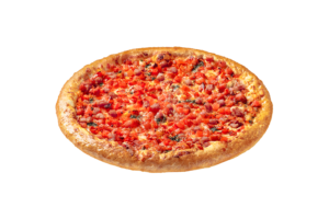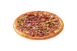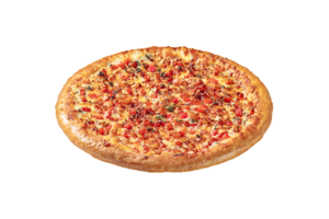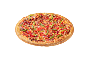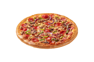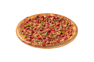 Salsa de Tomate, Queso Mozzarella, Pepperoni, Champiñón, Cebolla Morada, Carne de Beef y Pimentón Verde.