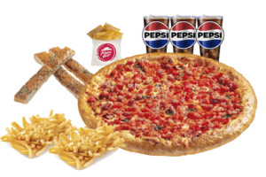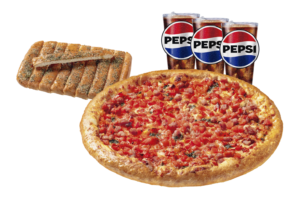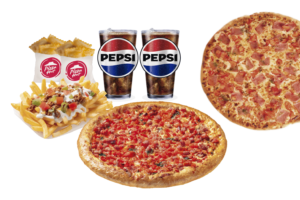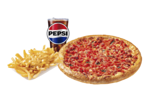 Queso mozzarella, aceitunas, champiñón, jamón y pepperoni, papa mediana y bebida mediana.